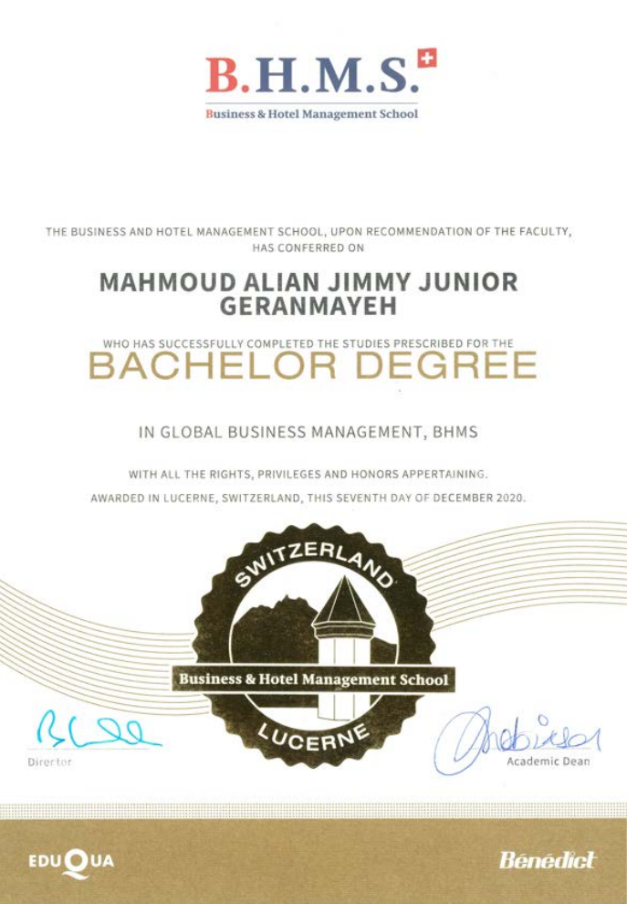 ich bin Jimmy Geranmayeh, 27 Jahre alt, aus Zürich. Mit einem Bachelor of Arts in Global Business Management von der BHMS in Luzern biete ich eine starke akademische Basis. Vor meinem Studium in der Schweiz verbrachte ich vier Jahre in Kuala Lumpur, Malaysia, wo ich das International Baccalaureate-Programm absolvierte, was meine interkulturelle Sensibilität und mein globales Denken förderte.
